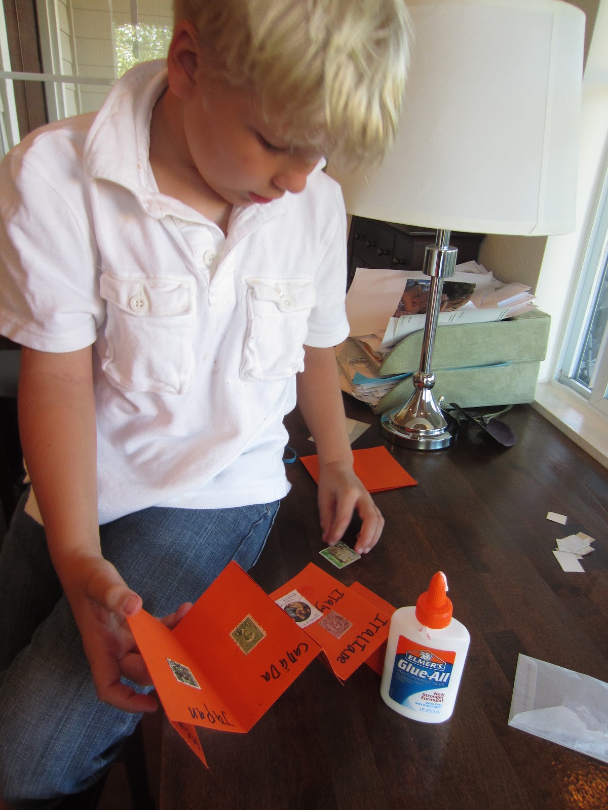 For a summer craft, we made stamp collections. This was something I did with my Cub Scout group, since one of the Bear electives is to start a stamp collection and display it.